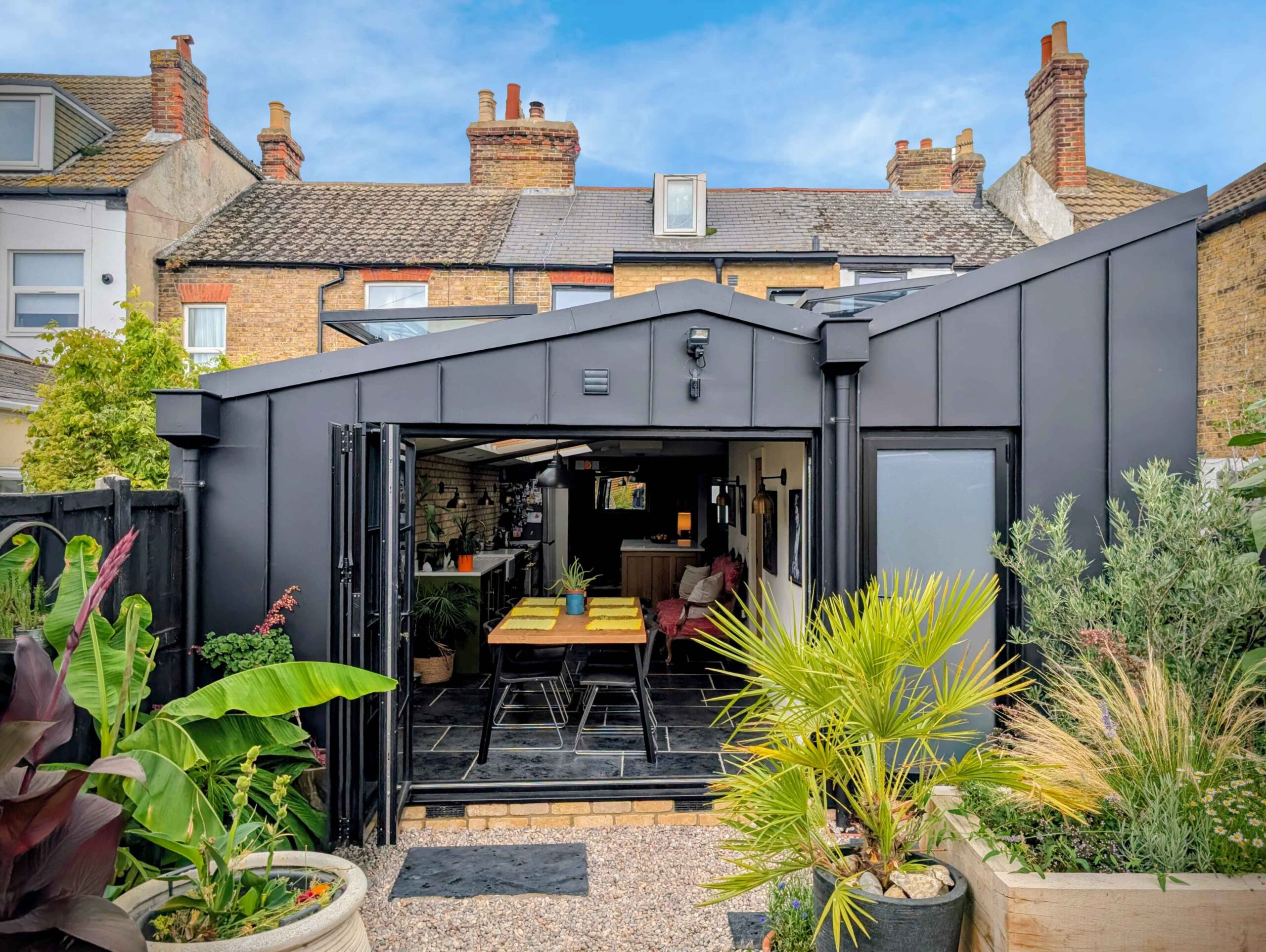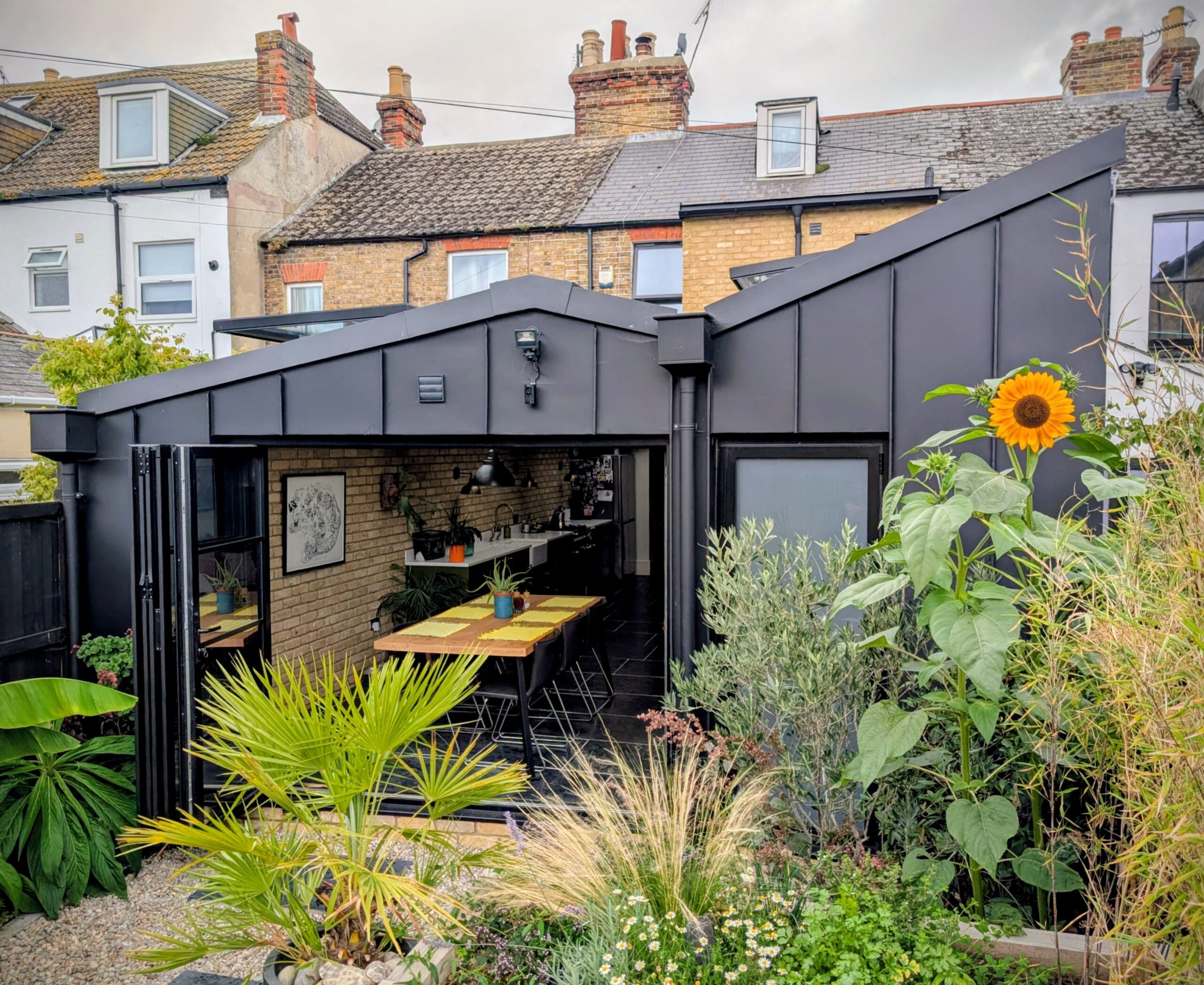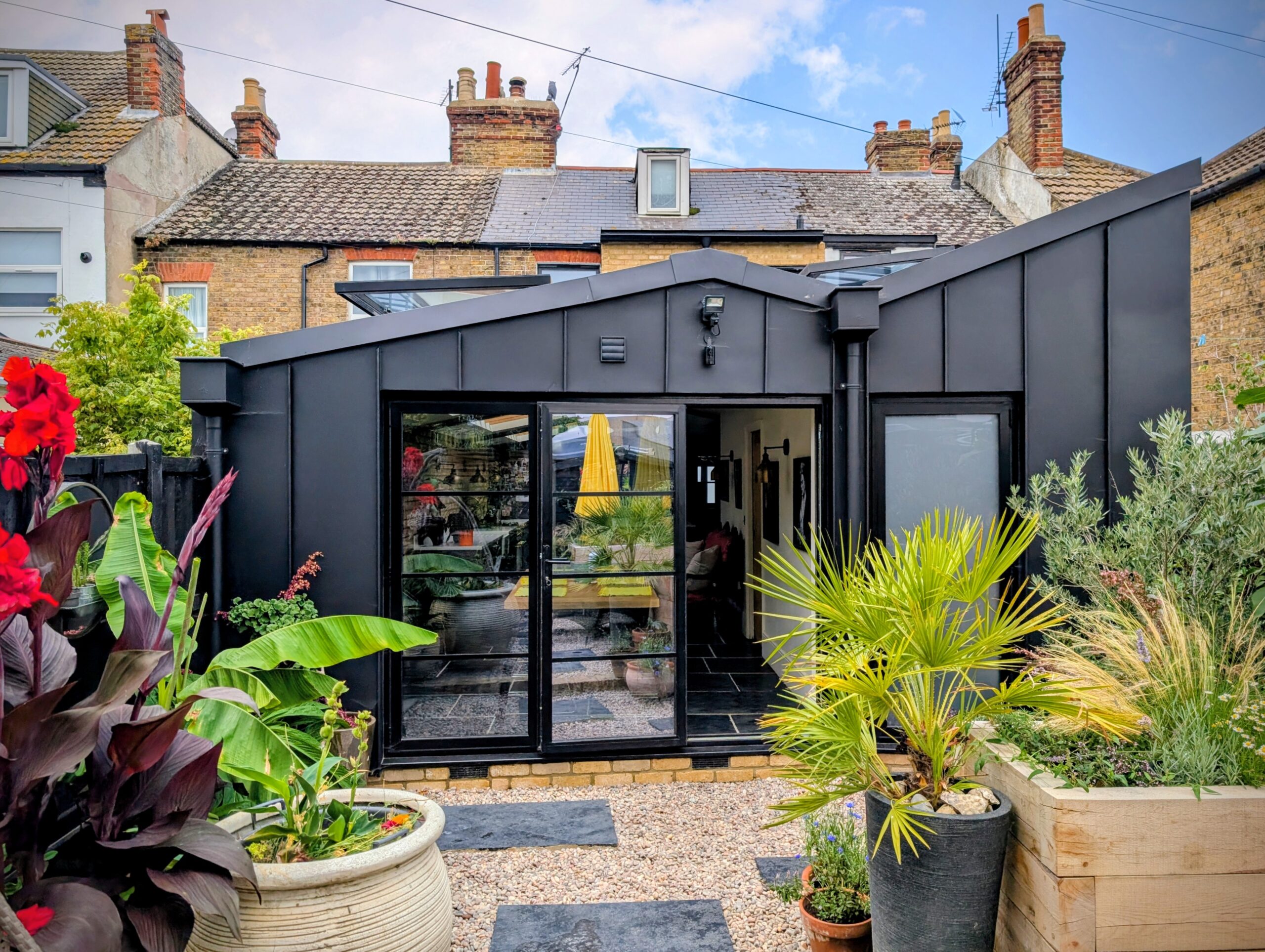 This contemporary Zig-Zag Extension in Whitstable demonstrates how bold modern design can work sensitively within a Conservation Area. The extension, named for its distinctive angular roofline, reconfigures and extends the rear of a traditional home to create a dynamic addition that enhances space, light and connection to the garden.