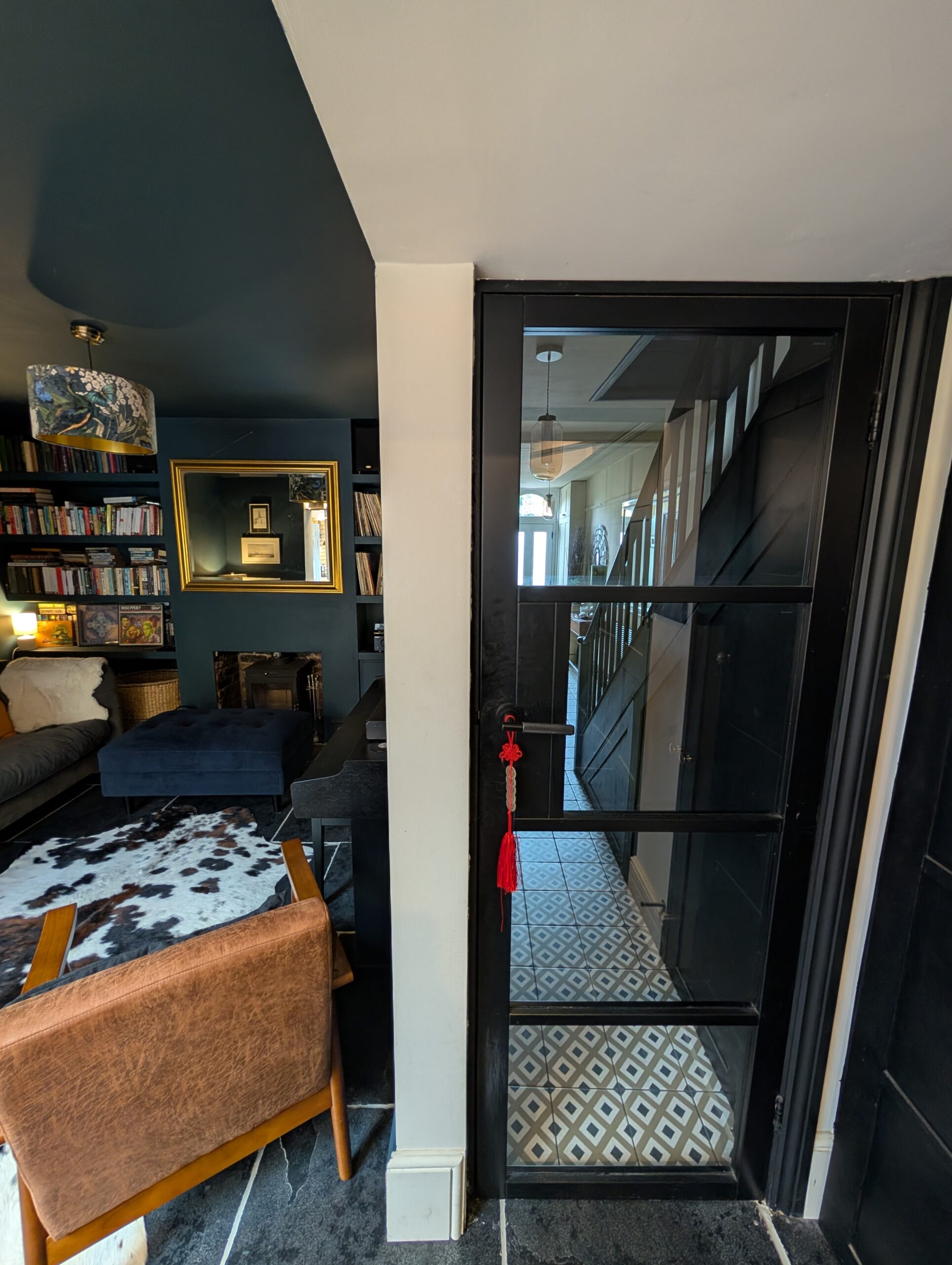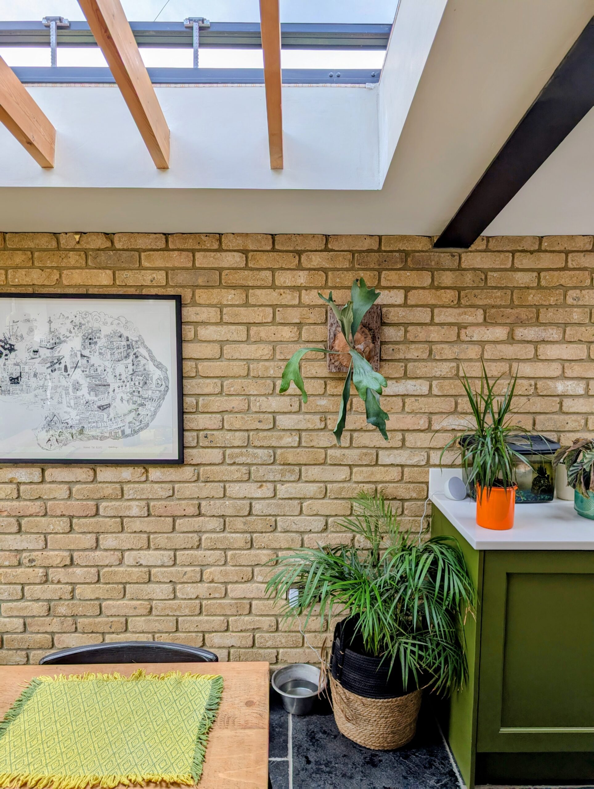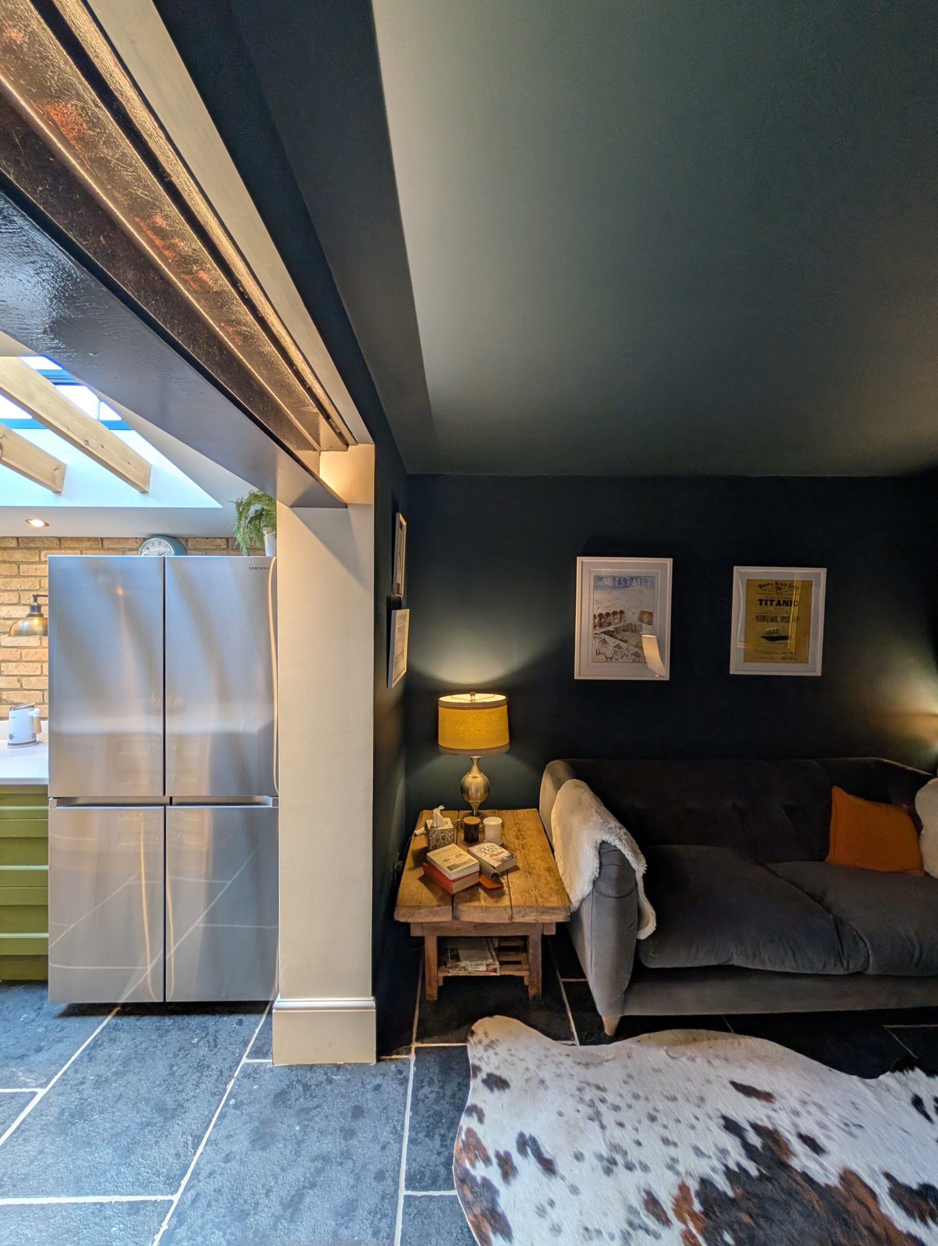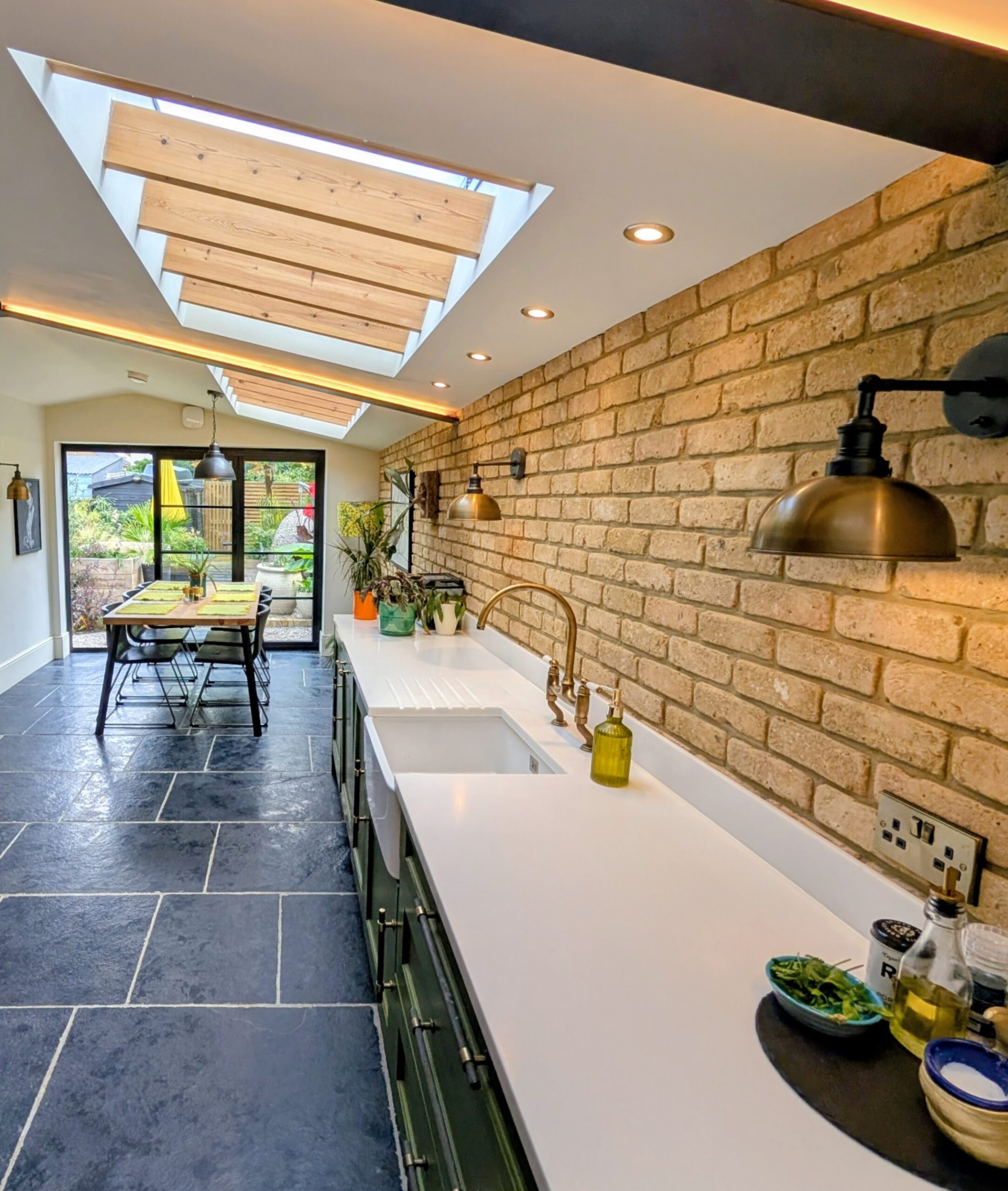Externally, the extension is clad in striking dark aluminium with a crisp zig-zag profile, contrasting against the original brickwork while remaining sympathetic to the Conservation Area. Inside, the space opens into a light-filled kitchen and dining room, with exposed brickwork, slate flooring and a dramatic rooflight bringing texture, warmth and daylight deep into the plan. Bifold doors provide a seamless link between indoors and the landscaped garden beyond.