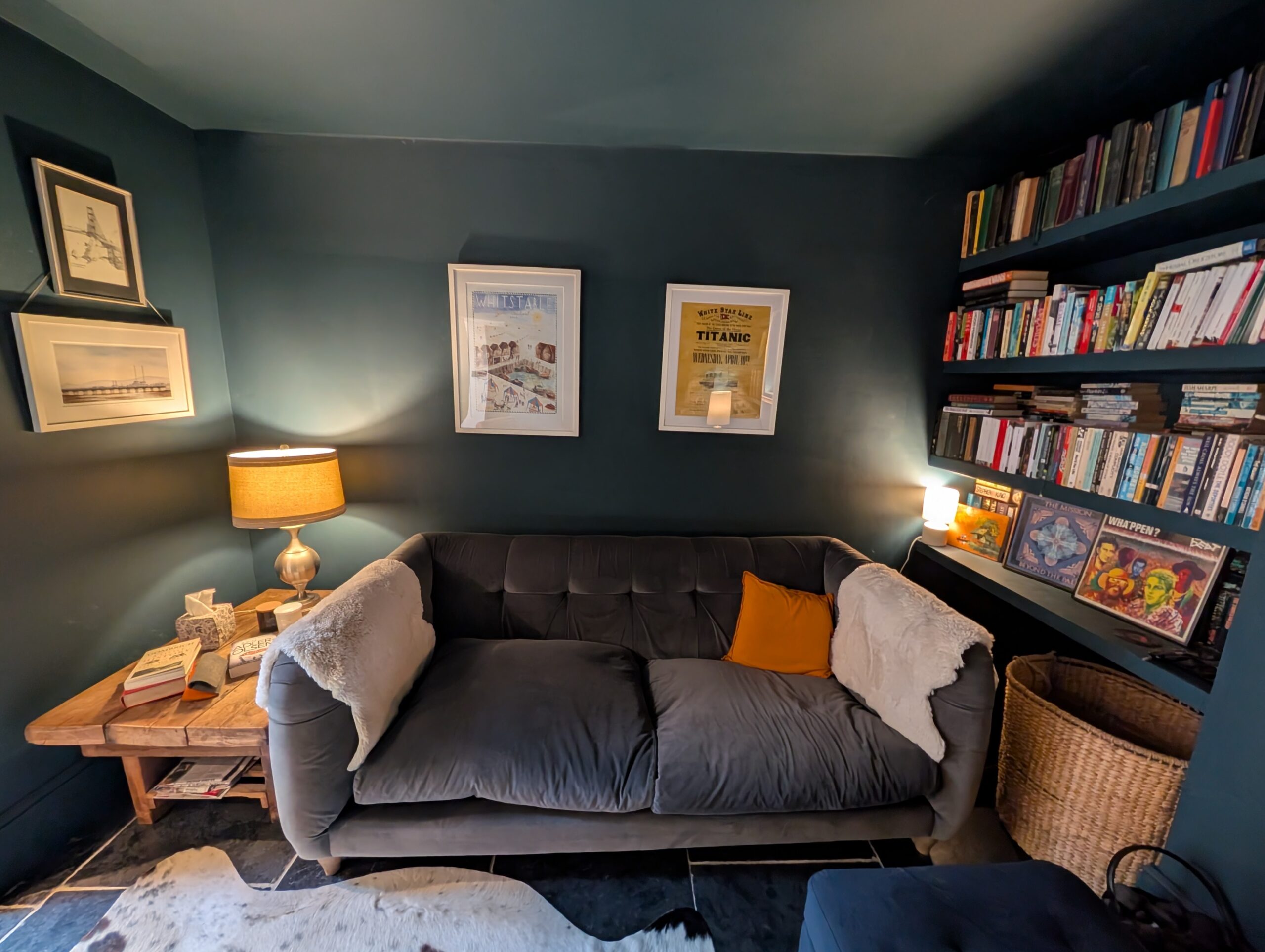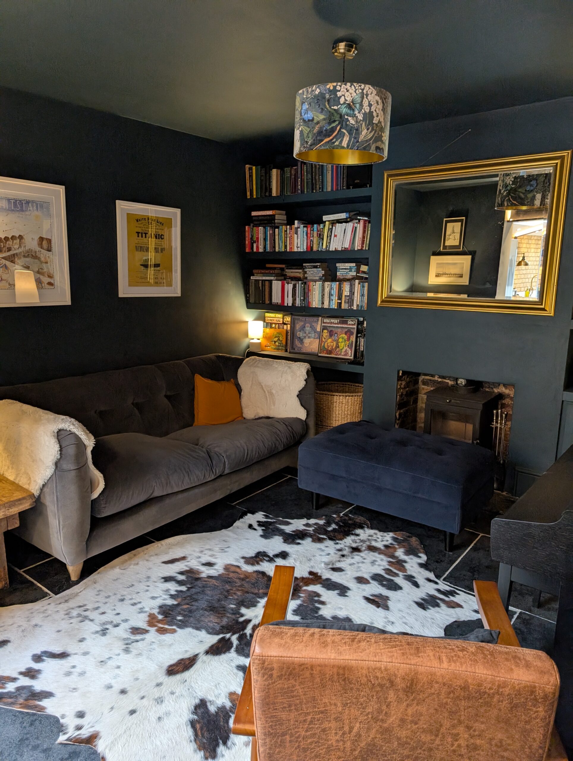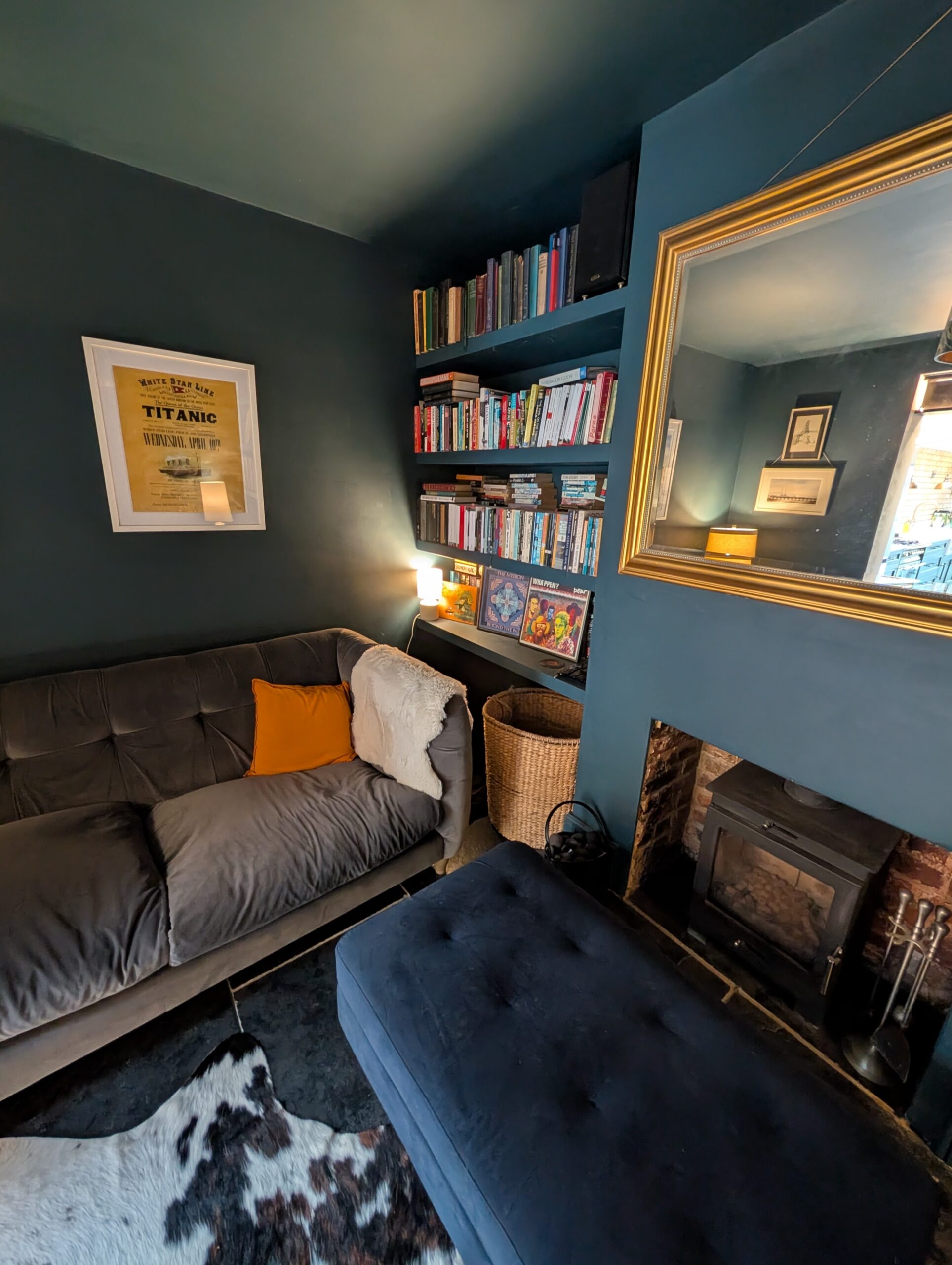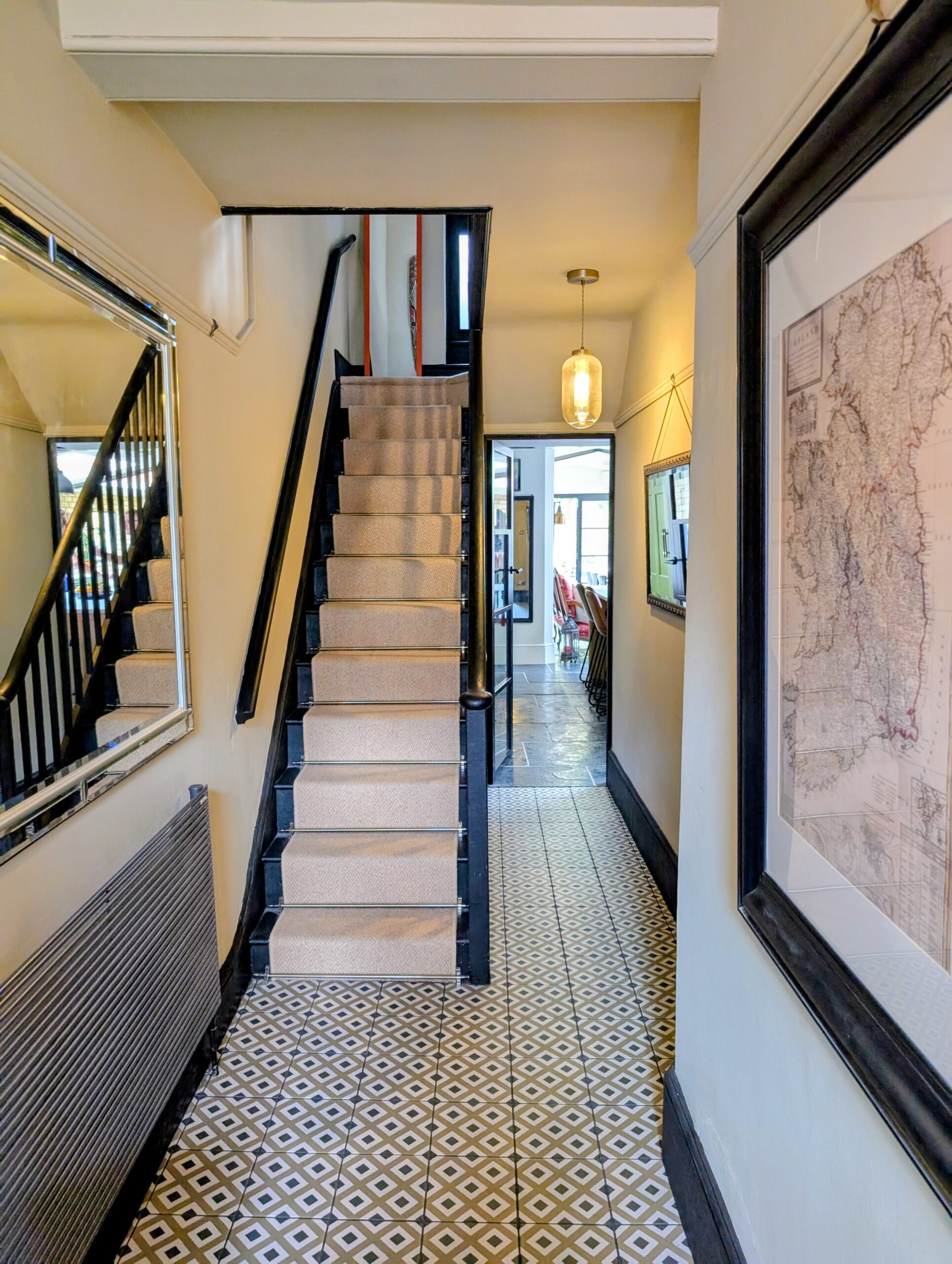 Externally, the extension is clad in striking dark aluminium with a crisp zig-zag profile, contrasting against the original brickwork while remaining sympathetic to the Conservation Area. Inside, the space opens into a light-filled kitchen and dining room, with exposed brickwork, slate flooring and a dramatic rooflight bringing texture, warmth and daylight deep into the plan. Bifold doors provide a seamless link between indoors and the landscaped garden beyond.